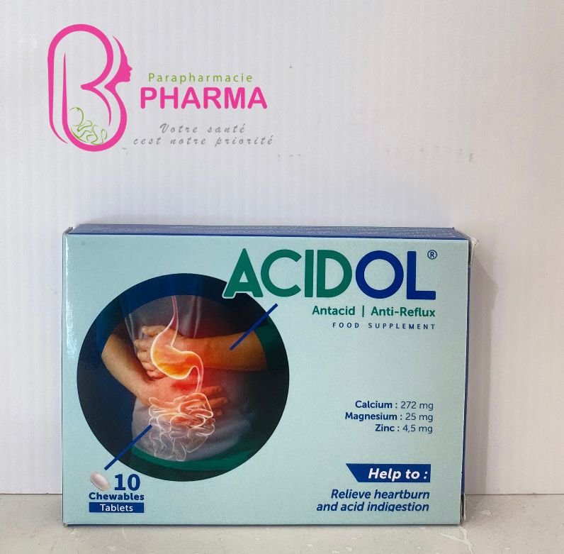 Acidol (boîte de 10 comprimés) est un médicament utilisé pour soulager les douleurs et les brûlures d’estomac liées à l’acidité gastrique, comme les reflux gastro-œsophagiens ou les indigestions.
