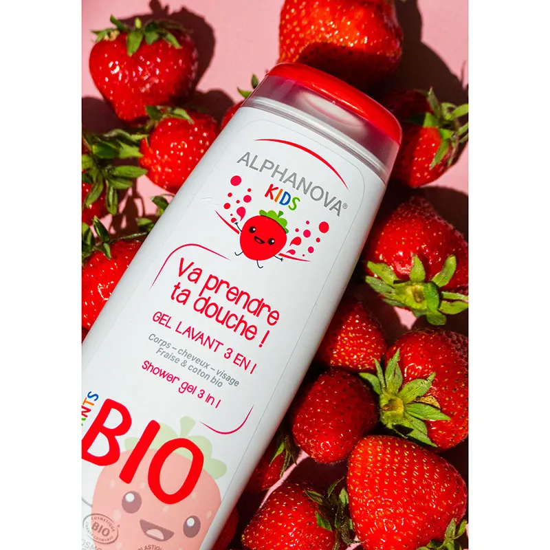 Le gel lavant 3 en 1 fraise bio 250 ml d’Alphanova Kids est un produit polyvalent conçu spécifiquement pour répondre aux besoins d’hygiène des enfants, tout en respectant leur peau sensible. Ce gel lavant combine trois fonctions essentielles en un seul produit : gel douche, shampooing et nettoyant visage, ce qui le rend pratique pour les parents à la recherche de solutions simples et efficaces. Sa formule douce est enrichie en extraits biologiques de fraise et d’aloe vera, deux ingrédients connus pour leurs propriétés nourrissantes et apaisantes. L’extrait de fraise apporte un parfum naturel et fruité, transformant l’heure du bain en un moment agréable et sensoriel pour les enfants. En plus de son parfum agréable, ce gel lavant est exempt de sulfates, de parabènes et de savon, garantissant qu’il ne dessèche ni n’agresse la peau délicate des tout-petits. Il est également hypoallergénique et testé dermatologiquement, ce qui en fait un produit sûr et doux même pour les peaux les plus sensibles. La texture légère et la mousse délicate du produit permettent un nettoyage en douceur de la peau et des cheveux sans risque d’irritation. Ce gel lavant est également une solution idéale pour les familles qui cherchent à adopter des produits bio et respectueux de l’environnement, grâce à sa certification biologique. Son flacon de 250 ml est pratique et permet une utilisation régulière, faisant de ce soin un choix parfait pour l’hygiène quotidienne de vos enfants. En choisissant ce gel lavant, vous optez pour un produit qui allie efficacité, sécurité et respect de la peau tout en apportant une touche fruitée et agréable au bain.