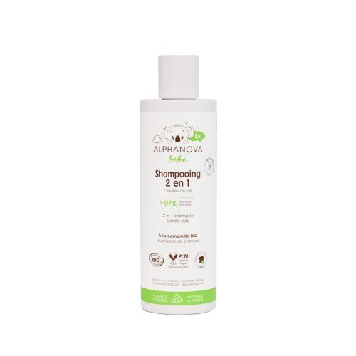 Le shampooing 2 en 1 ALPHANOVA bébé® BIO nettoie délicatement et aide à prévenir et réduire les croûtes de lait du cuir chevelu de bébé. Enrichi en camomille bio, il protège les cheveux et le cuir chevelu du dessèchement lié à l’eau calcaire.
