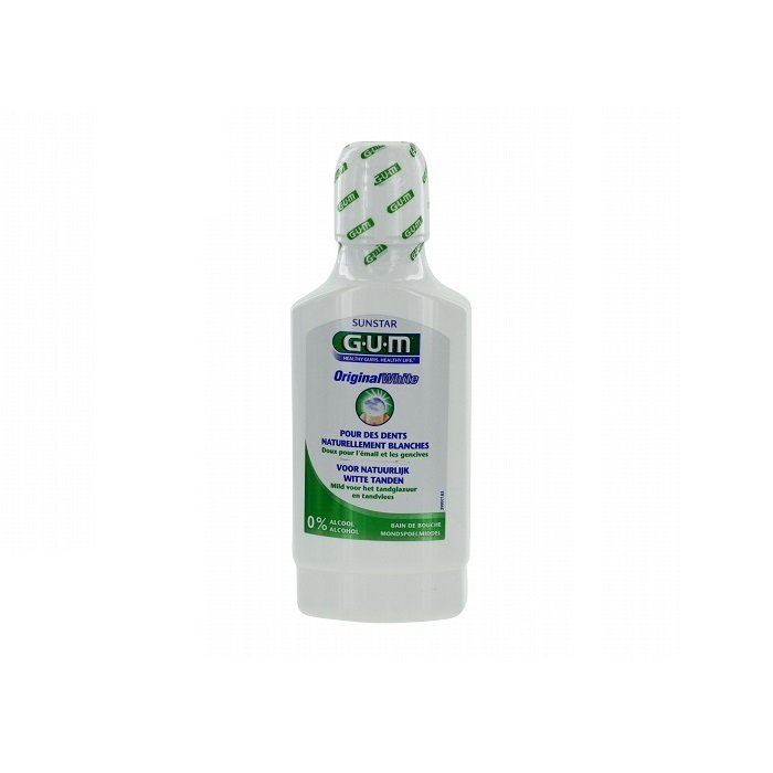 Le bain de bouche Original White de GUM permet d’éliminer en douceur les taches de coloration (thé, café, tabac…) sur vos dents tout en les protégeant.