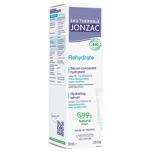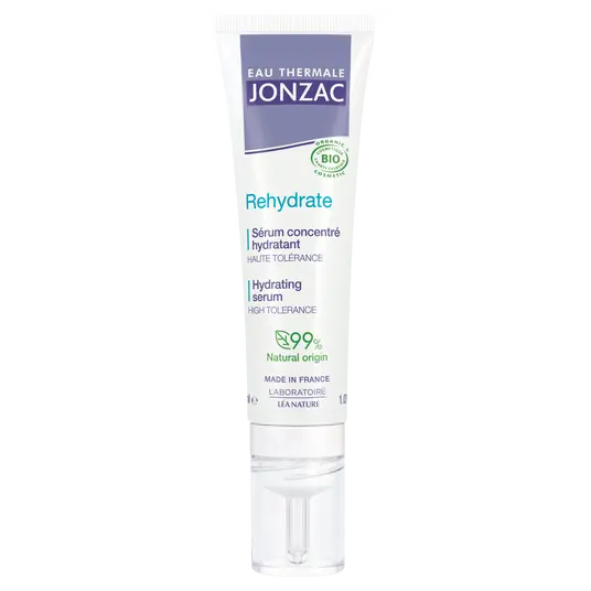Le Sérum Réhydrate Jonzac se distingue par sa composition naturelle et haute tolérance, certifiée Cosmébio et Ecocert.