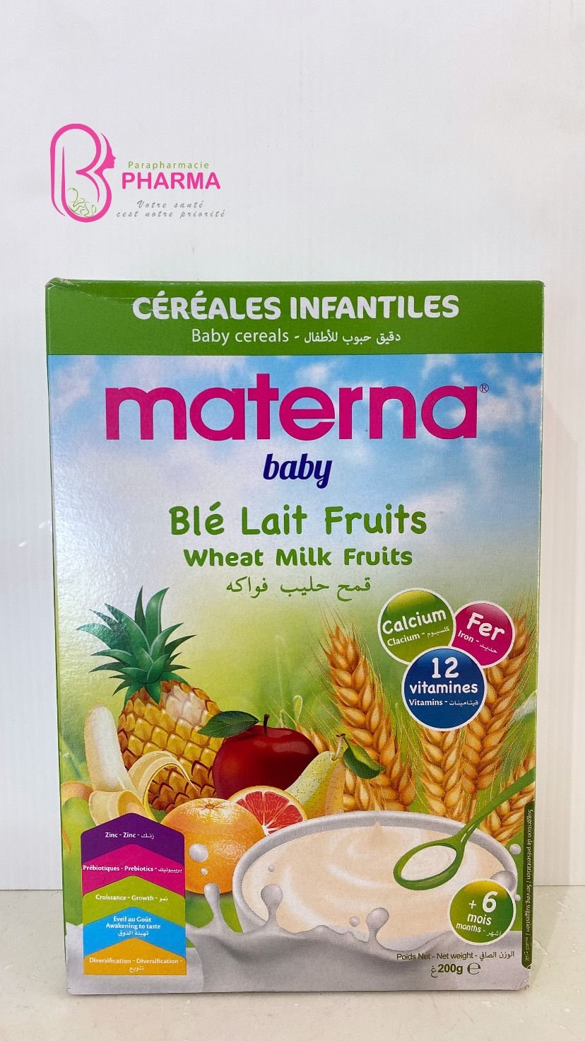- Materna Farine de blé lait 5 fruits est un aliment pour bébés, composé de farine de blé, de lait et de cinq fruits, conçu pour offrir une alimentation équilibrée aux tout-petits.
