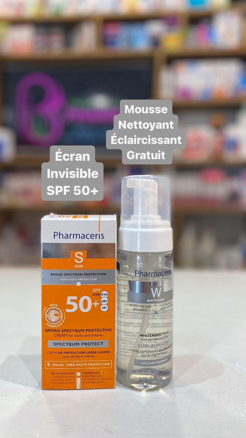 Le coffret Pharmaceris S Spectrum-Protect Crème SPF 50+ (50 ml) et W Puri Albucin Mousse nettoyante éclaircissante (150 ml) comprend :