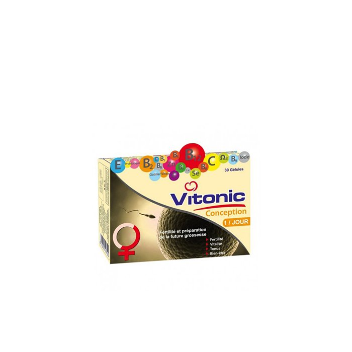VITONIC CONCEPTION apporte les éléments nécessaires pour éviter toute carence et préparer la future grossesse en associant 10 vitamines et 4 minéraux, aux oméga 3, aux probiotiques et à un extrait de gatillier vitex : une plante qui augmente la fertilité et les chances de procréation.